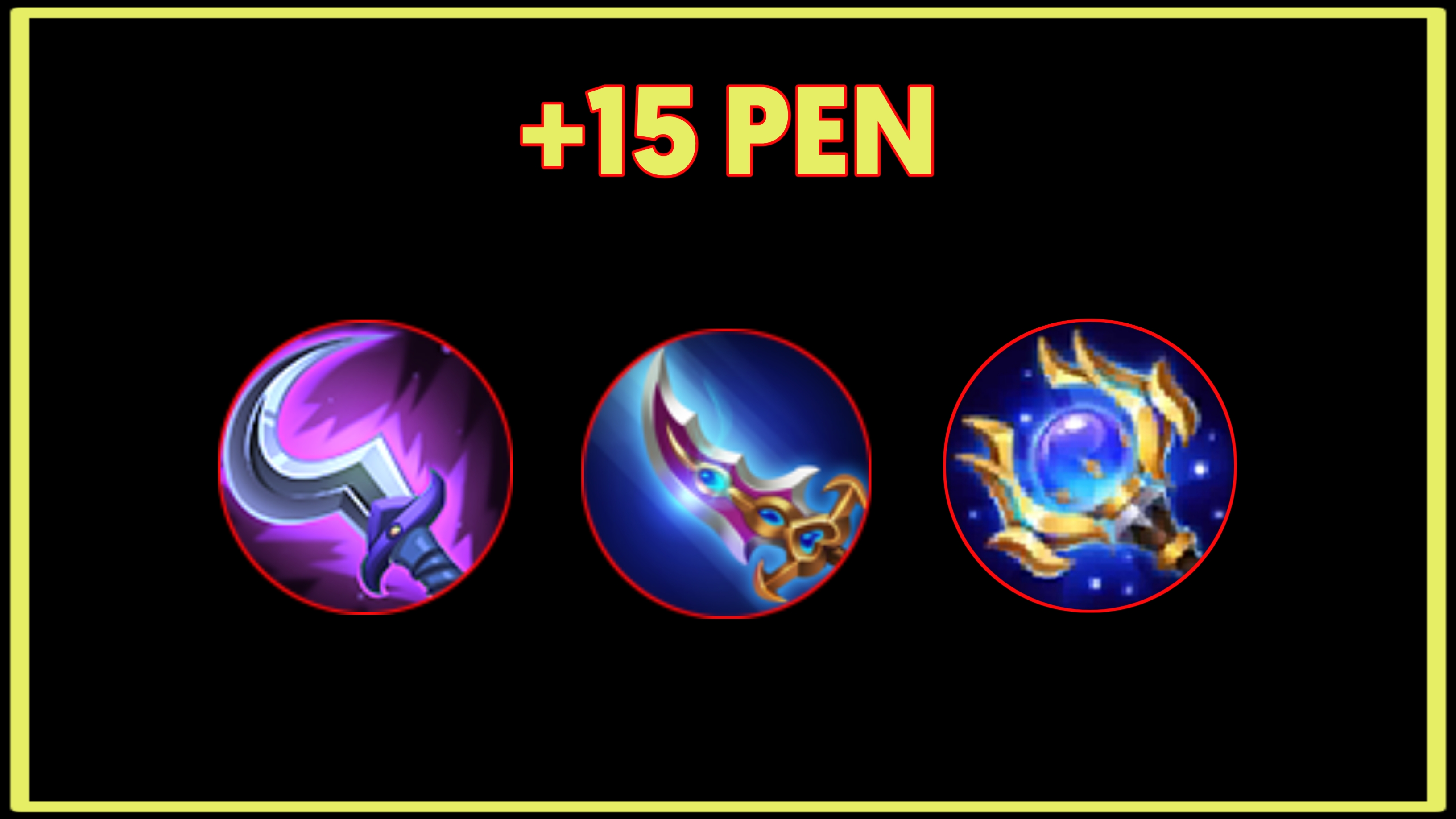 +15 PEN ဆိုတာက ရန်သူ့ရဲ့ Defence ထဲက 15 Point တိုက်ရိုက်နှုတ်တာပါ။ Physical Def တအားများတဲ့ Tank တွေကိုဆို 15 point လောက်နှုတ်တာက ဘာမှမသိတာပေမယ့် တခြားသော Defence နည်းတဲ့ Hero တွေကို Damage ပေးရမယ်ဆိုရင်သုံးပါတယ်။ MM , ASS , Mage , Sup တွေမှာဆိုရင် မူလထဲက Defence 20 ဝန်းကျင်လောက် ပါပါတယ်။ သူတို့တွေကို Damage ပိုနာစေဖို့ဆိုရင် +15 PEN နဲ့တင်လုံလောက်ပါတယ်။ Blade of Heptaseas (physical) , Hunter Strike (physical) နဲ့ Genious Wand (magic) တို့က +15 PEN ပါတဲ့ Items တွေပဲ ဖြစ်ပါတယ်။